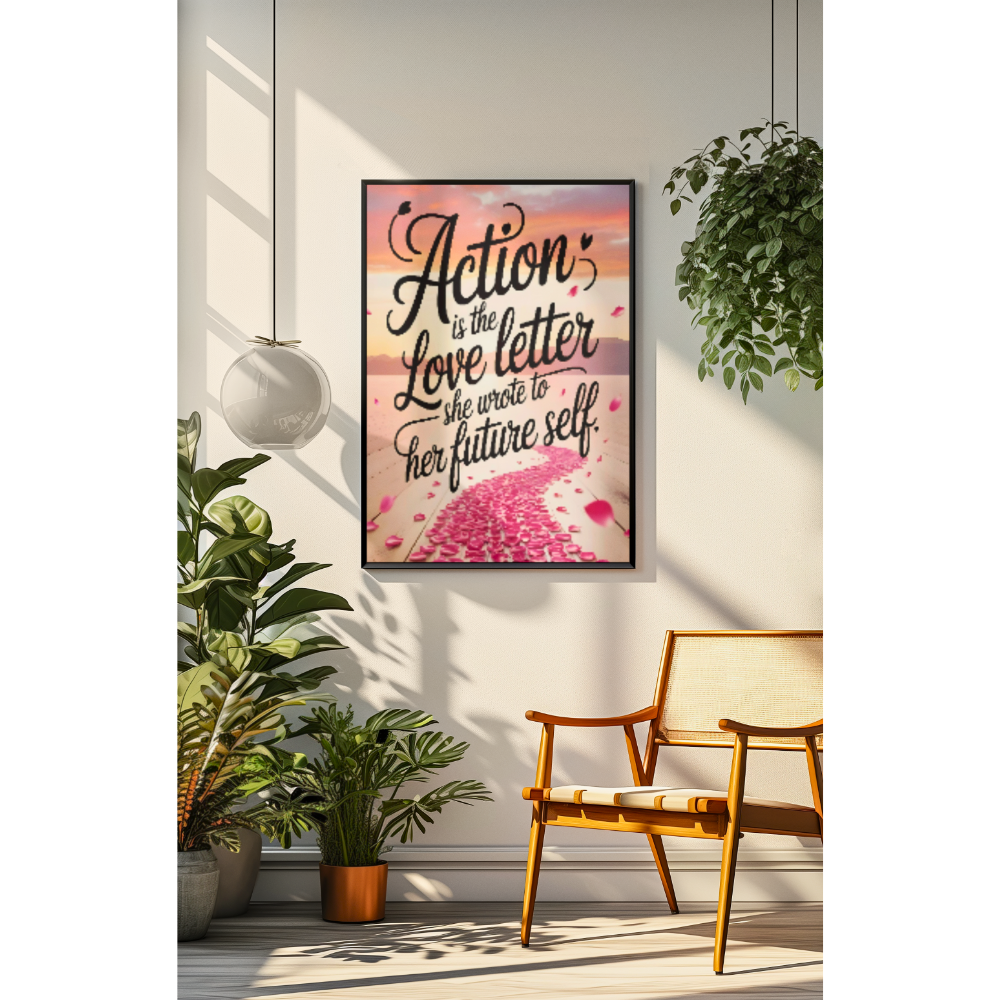 The central motif features an elegant cursive script that seamlessly blossoms into a pathway of lush rose petals, guiding the eye toward a warm, sunlit horizon. This isn’t just a quote; it’s a visual metaphor for how small, consistent actions—written like love letters to your future—create the beautiful reality you walk toward.