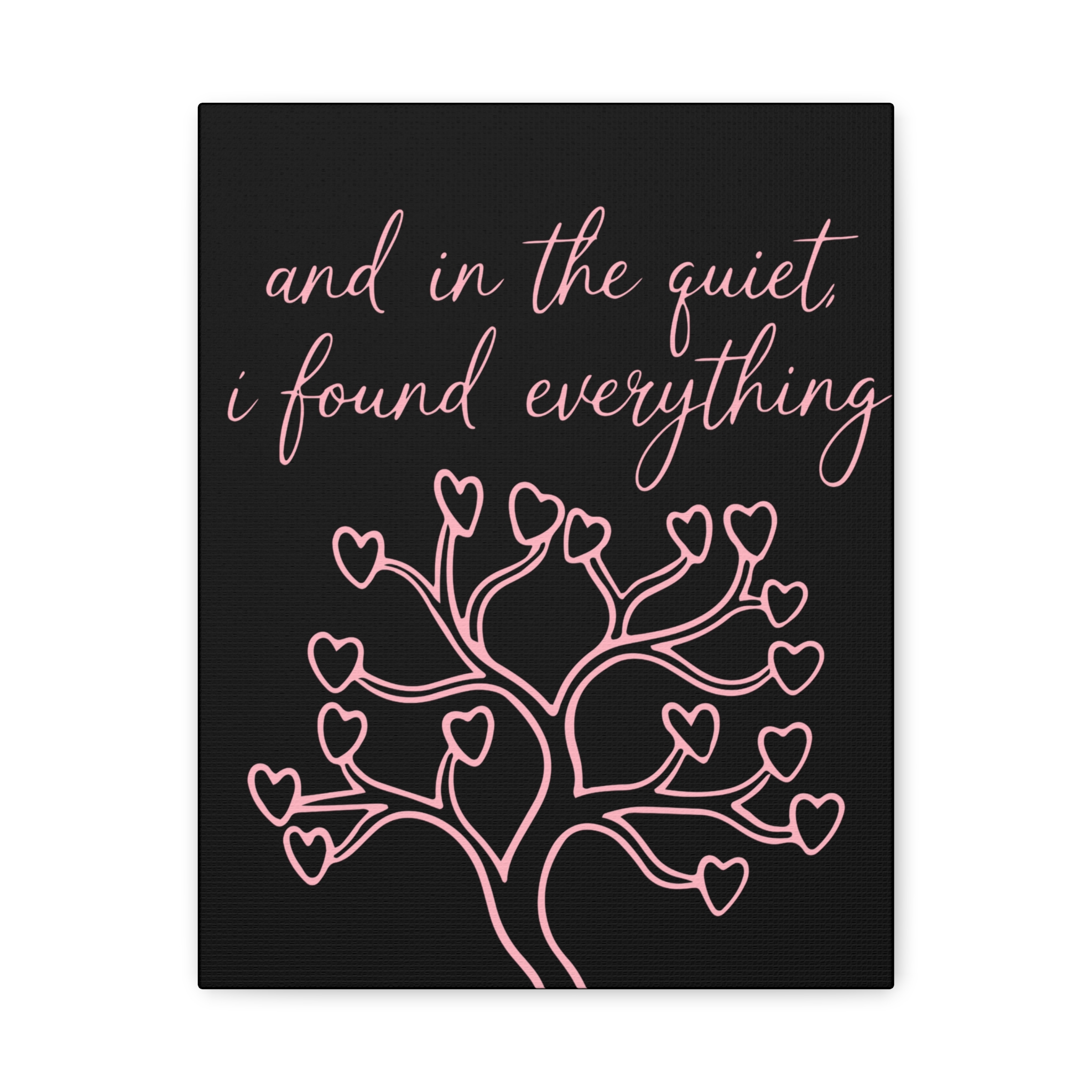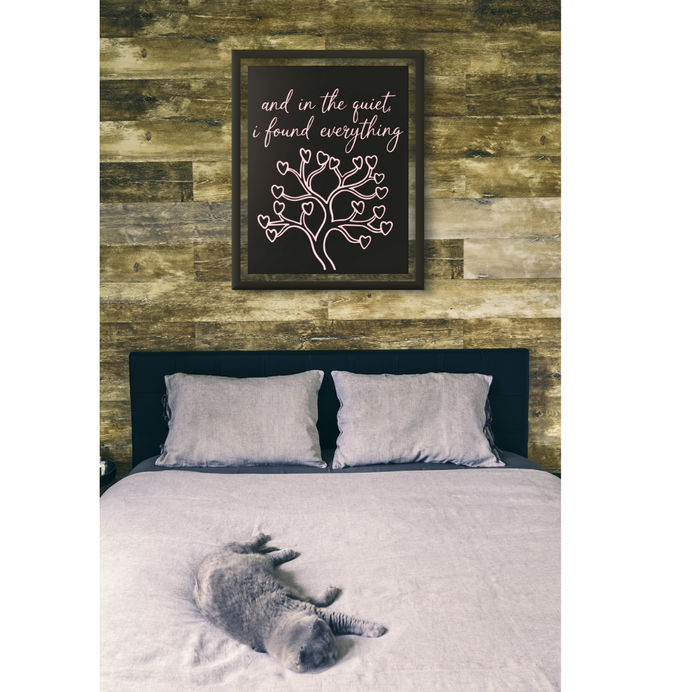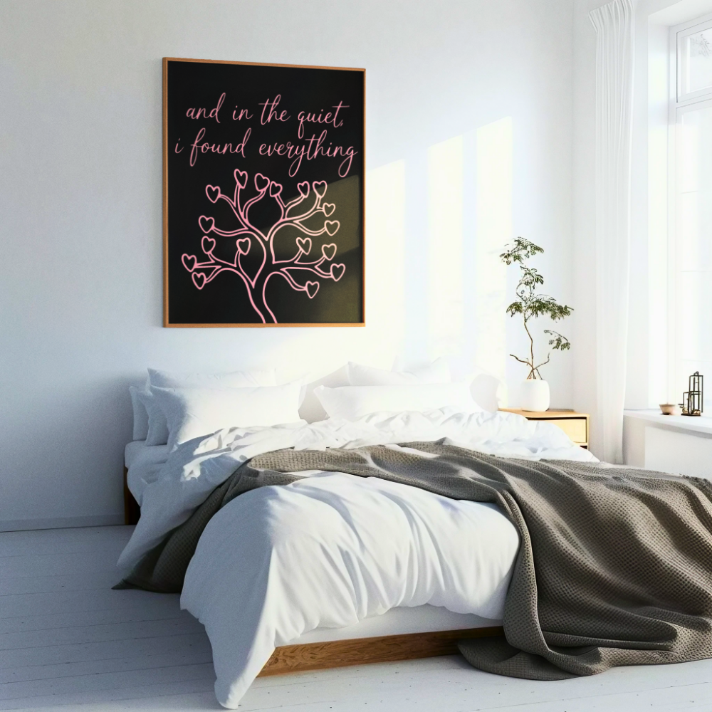 A matte stretched canvas that brings quiet poetry to the wall. Soft pink script and a delicate heart-shaped tree glow against a deep black field, giving a calm, intimate presence to bedrooms, reading nooks, or meditation corners. The subtle texture of the cotton-poly canvas and the 1.25″ radial pine stretcher create a refined, gallery-style look that feels both personal and thoughtfully crafted. Hang it low by a favorite chair or let it anchor a simple gallery grouping — it settles into spaces where stillness and reflection matter.